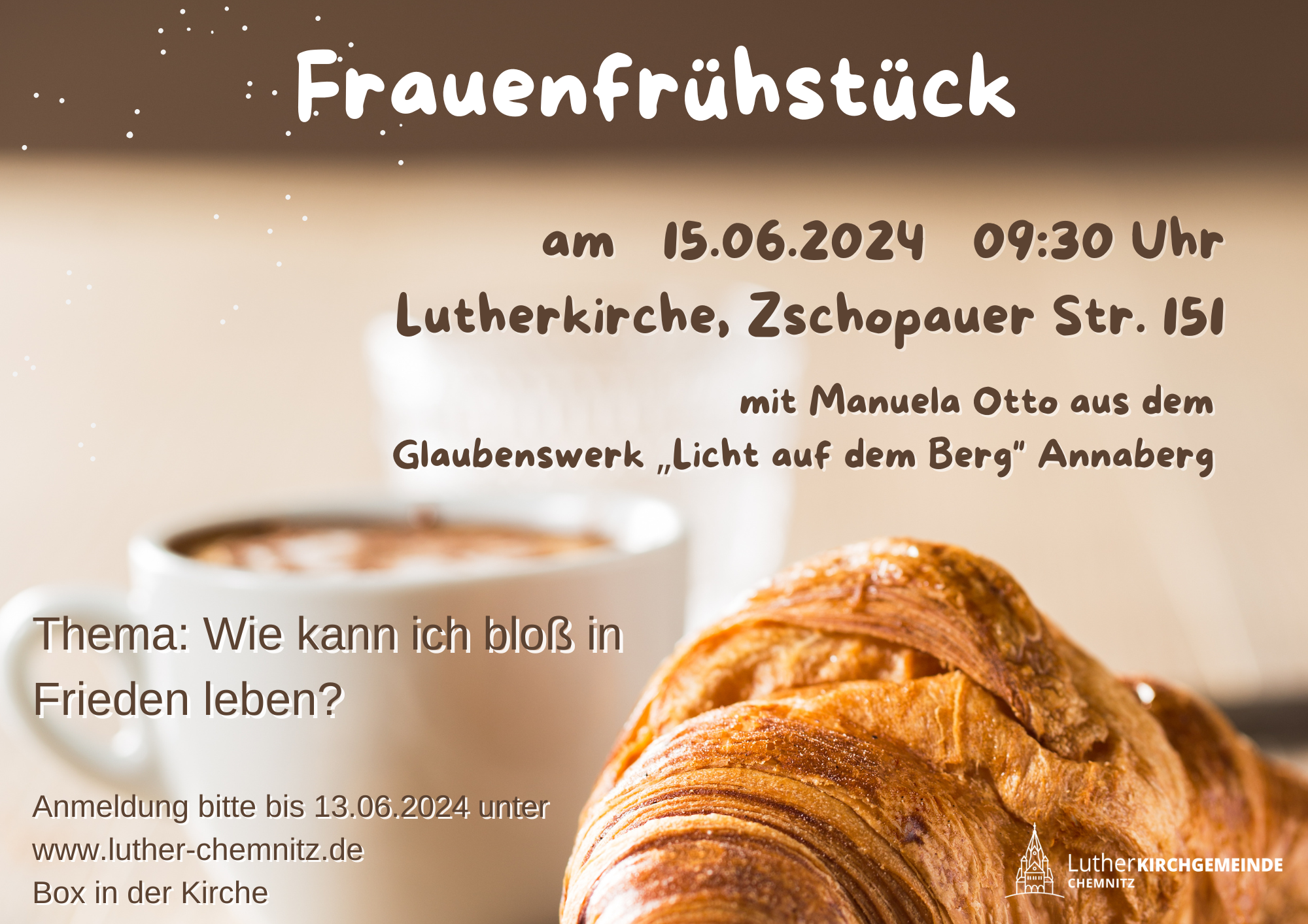 15.06.2024, 09:30 Uhr, Frauenfrühstück in Lutherkirche mit Manuela Otto aus dem Glaubenswerk „Licht auf dem Berg" Annaberg, Thema: "Wie kann ich bloß in Frieden leben?" (Flyer im Anhang)