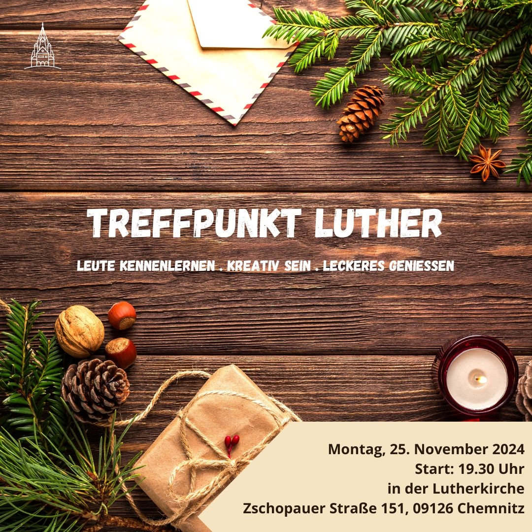 Am 25.11.24 findet ab 19:30 der "Treffpunkt Luther im Advent" statt. Wir werden gemeinsam Geschenke für die Senioren einpacken und sortieren, Alphaeinladungen und kleine Geschenke für den Weihnachtspavillion auf der Bernsdorfer Strasse vorbereiten. Es besteht auch die Möglichkeit einen Adventskranz zu binden, wir wollen singen, Glühwein oder Tee trinken, am Lagerfeuer verweilen und grillen. Ein besonderer Abend. Verlegt doch einfach Euren Hauskreis in die Kirche und verbringt dort den Abend!