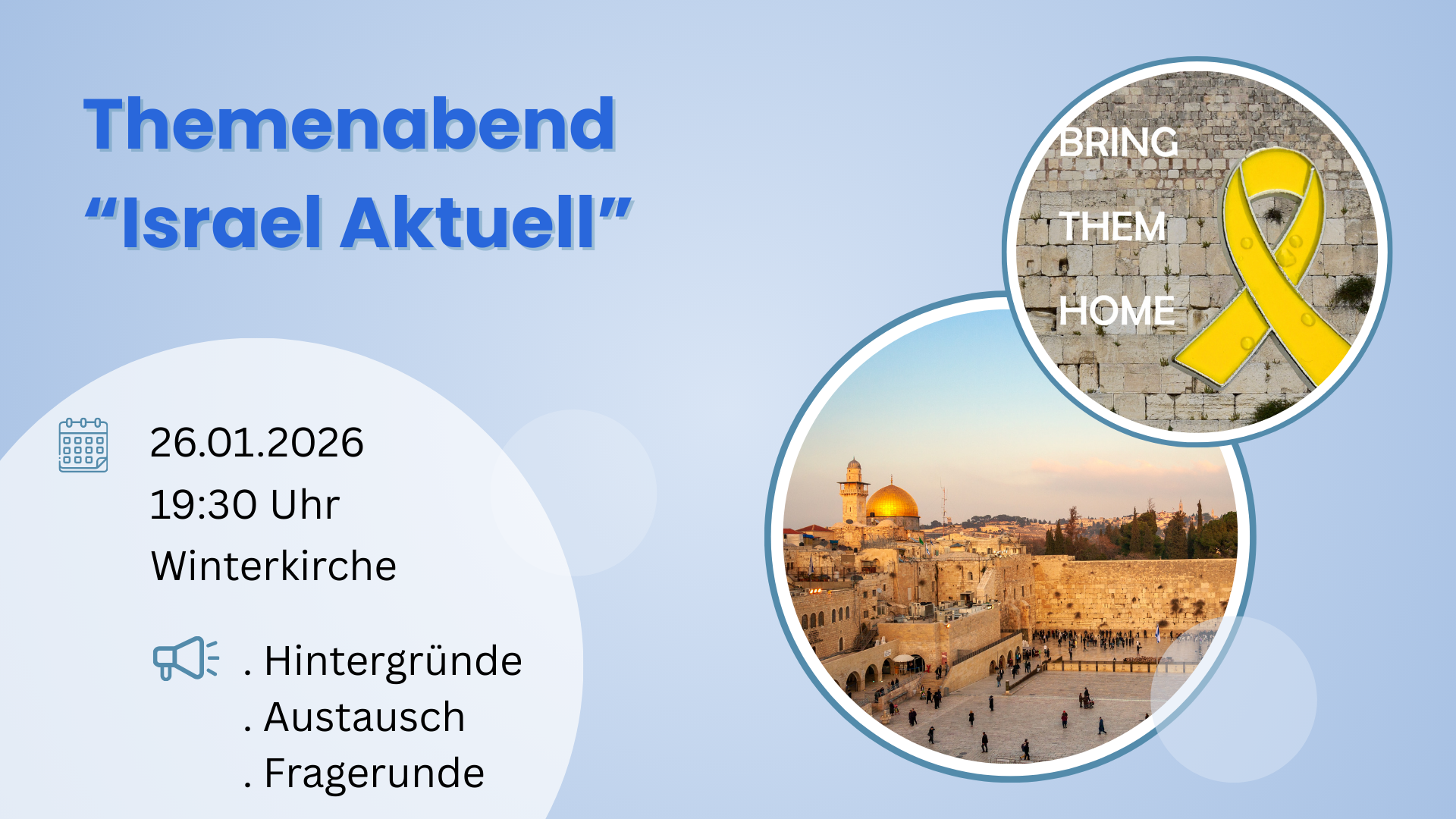 herzliche Einladung zum Themenabend "Israel aktuell" am 26.01.2026, ab 19:30 Uhr in der Lutherkirche Chemnitz. Wir werden grundlegende Impulse und Gedanken über die Beziehung und das Verhältnis zu Israel hören uns zur gegenwärtigen Situation in und um Israel informieren und austauschen. Dieser Abend dient auch dazu, Fragen zu stellen, einander zu zu hören, vermutlich auch zu diskutieren und zu beten. Ein Flyer ist im Anhang zu finden. Ich bitte die kurzfristige Ankündigung zu entschuldigen.