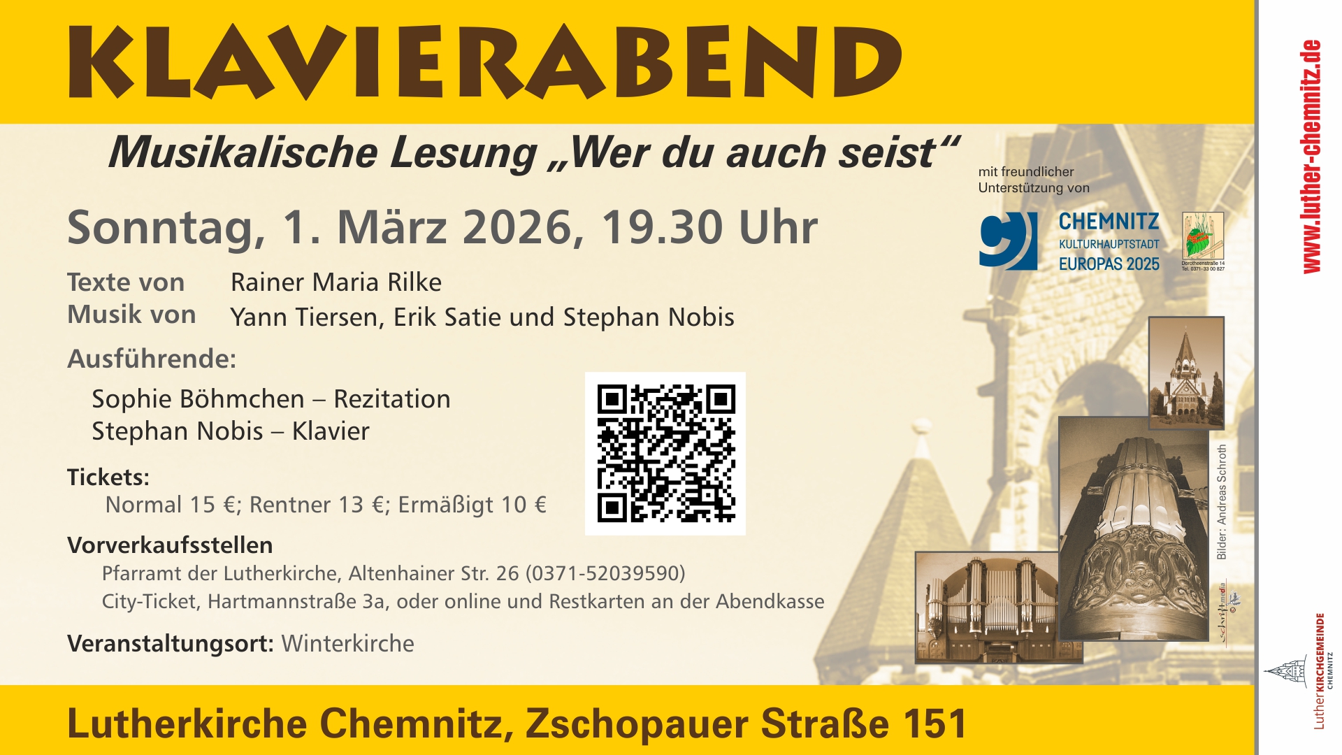 - 01.03.2026, 19:30 Uhr, Klavierabend-Musikalische Lesung „Wer du auch seist“ (Flyer im Anhang)