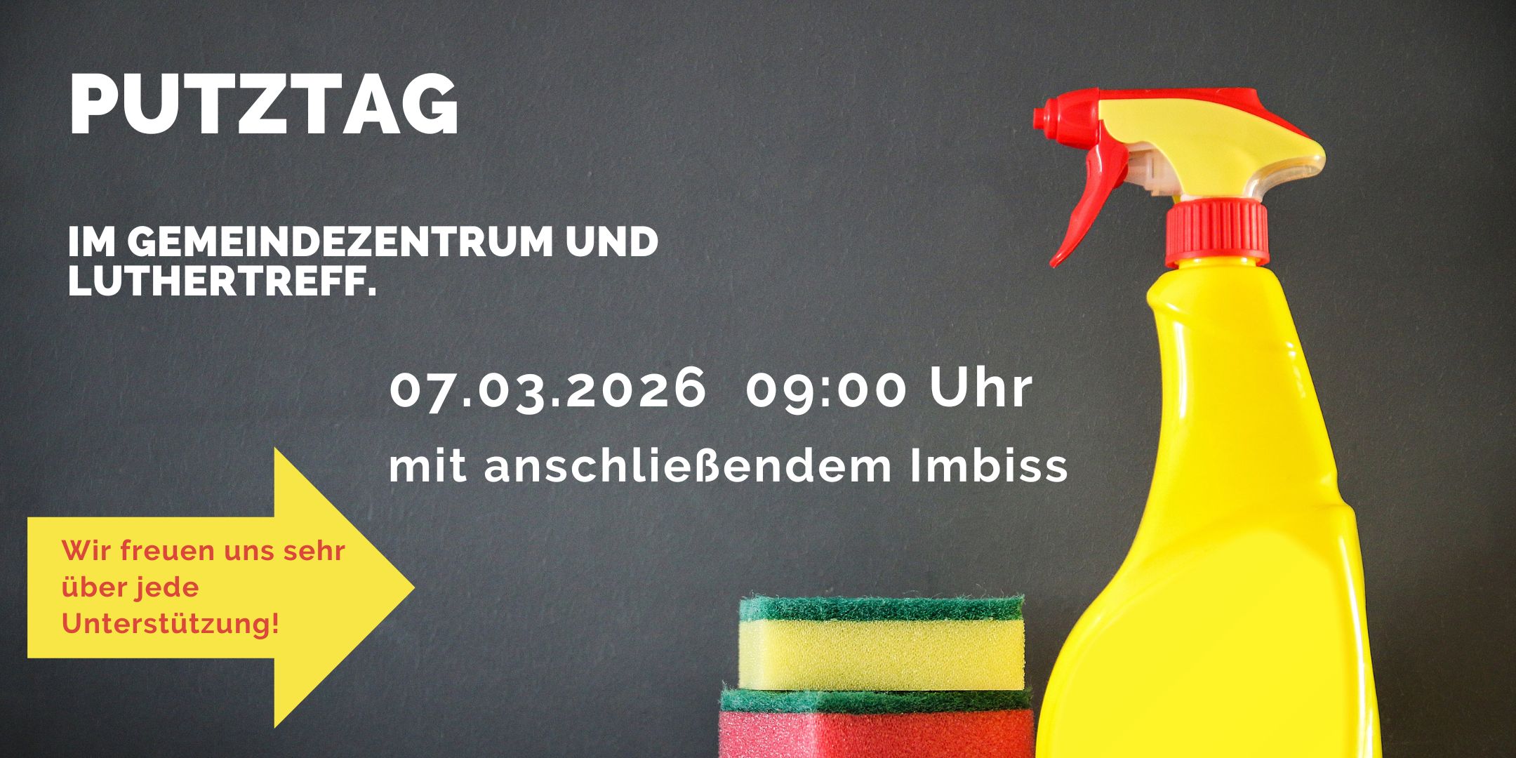 am kommenden Samstag, den 7. März findet im Gemeindezentrum der Lutherkirchgemeinde, Altenhainer Str. 26 und im Luthertreff., Augsburger Str. 14 von 9.00 - 12.00 ein Putztag statt. Wir wollen vor allem das putzen, was bei der wöchentlichen Reinigung nicht gemacht werden kann (Fenster putzen, Schränke auswischen, Stühle säubern, Grundreinigung Küche, ...).