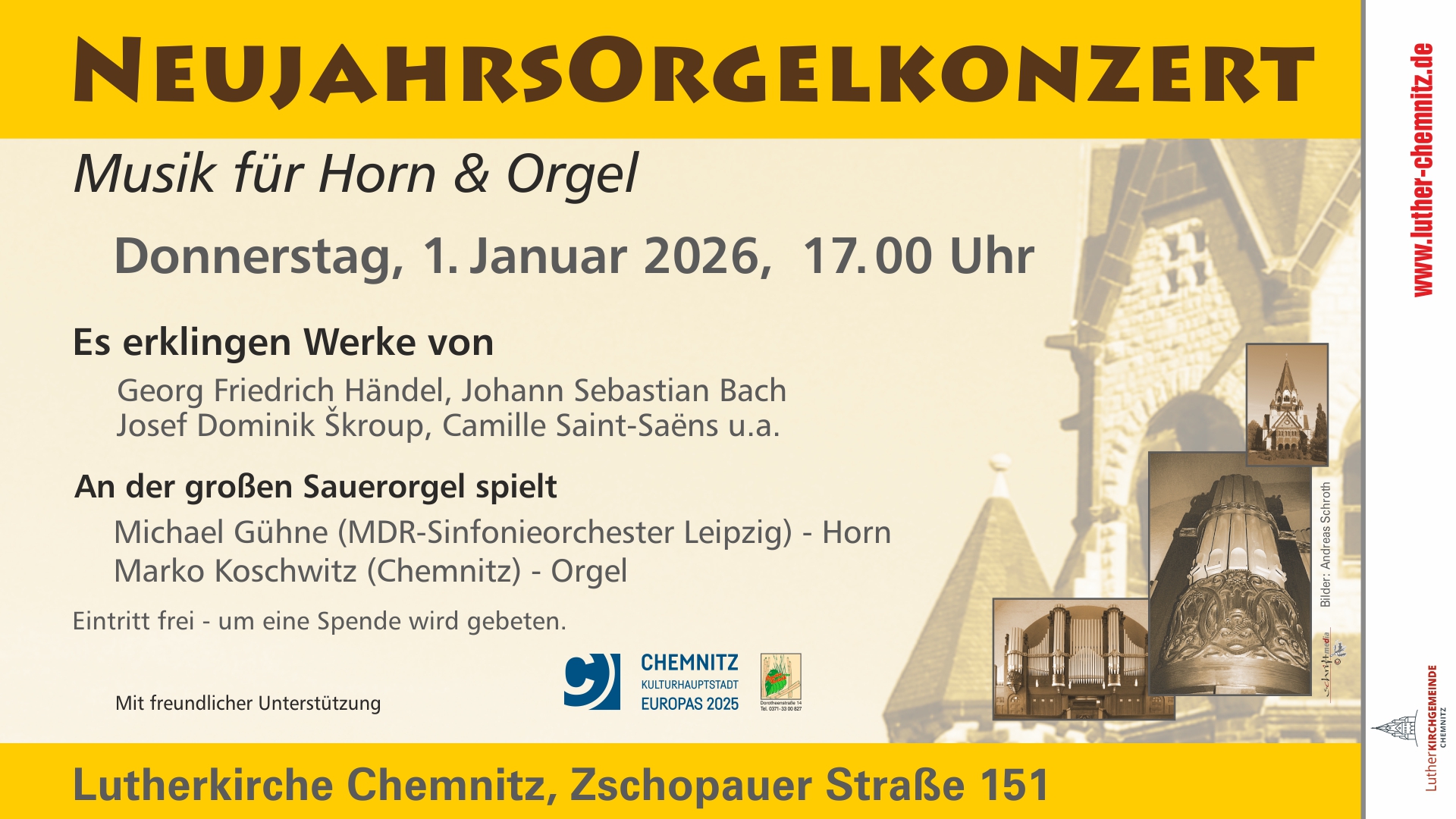 Am 01. Januar 2026 um 17.00 Uhr laden wir zum traditionellen Neujahrskonzert ein. Auf dem Programm steht dieses Mal Musik für Horn und Orgel und wie in jedem Jahr gibt es Gedanken zur neuen Jahreslosung. Es erklingen Werke von Georg Friedrich Händel, Johann Sebastian Bach, dem tschechischen Komponisten Josef Dominik D. Škroup, aber auch von französischen Komponisten wie Camille Saint Saëns, Théodore Dubois und Eugène Gigout.