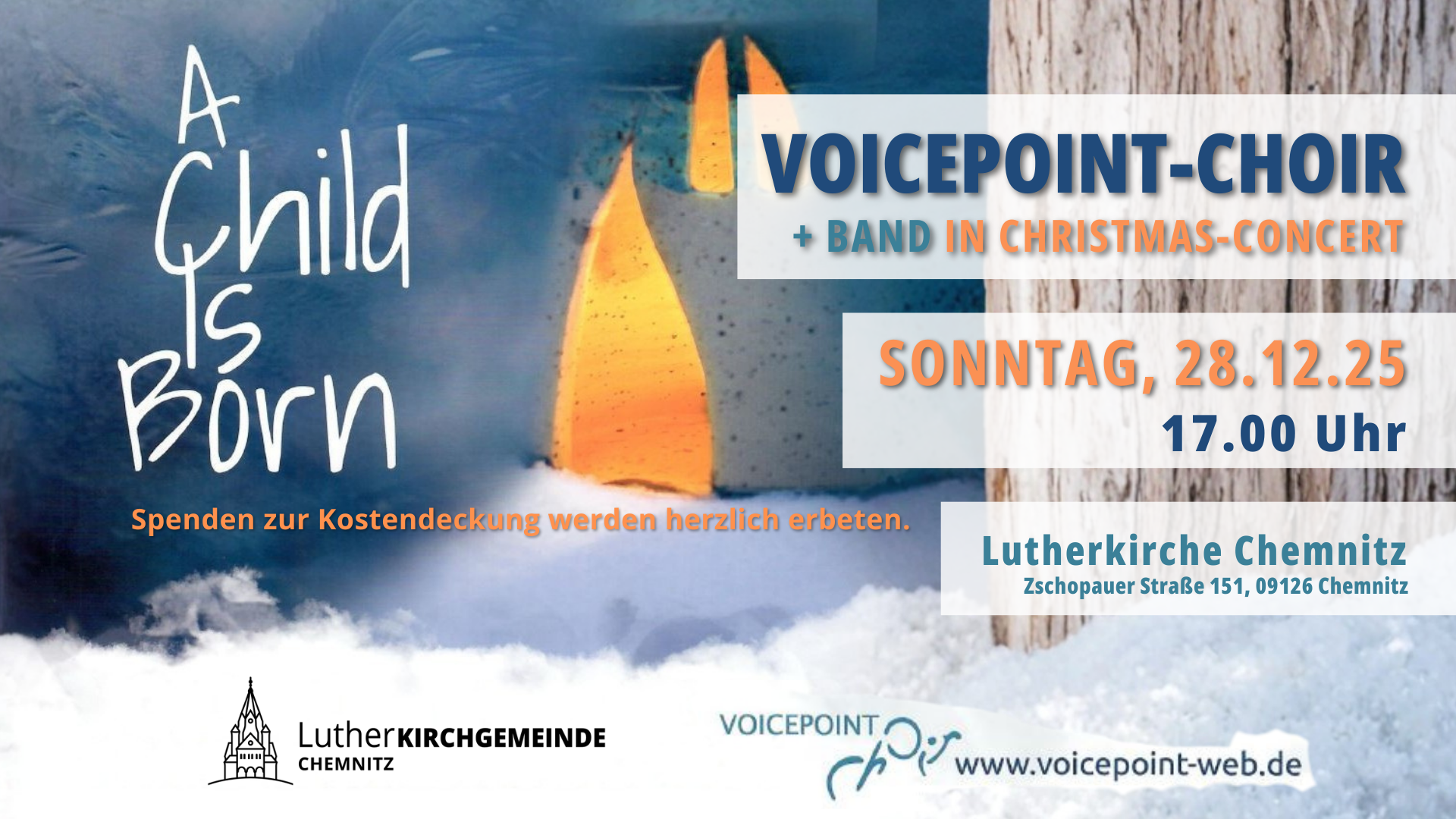 Mit dem Programm "A Child Is Born" lädt der VOICEPOINT-CHOIR noch einmal zum Weihnachtskonzert ein. Kraftvolle Gospelsongs, interessante Pop-Arrangements und Bearbeitungen alter und neuer Weihnachtslieder sind ebenso ein fester Bestandteil des Konzertes wie das gemeinsame Singen mit dem Publikum und gelesene Betrachtungen zum Wunder der Weihnacht. Der Chor wird live von seiner Band begleitet.