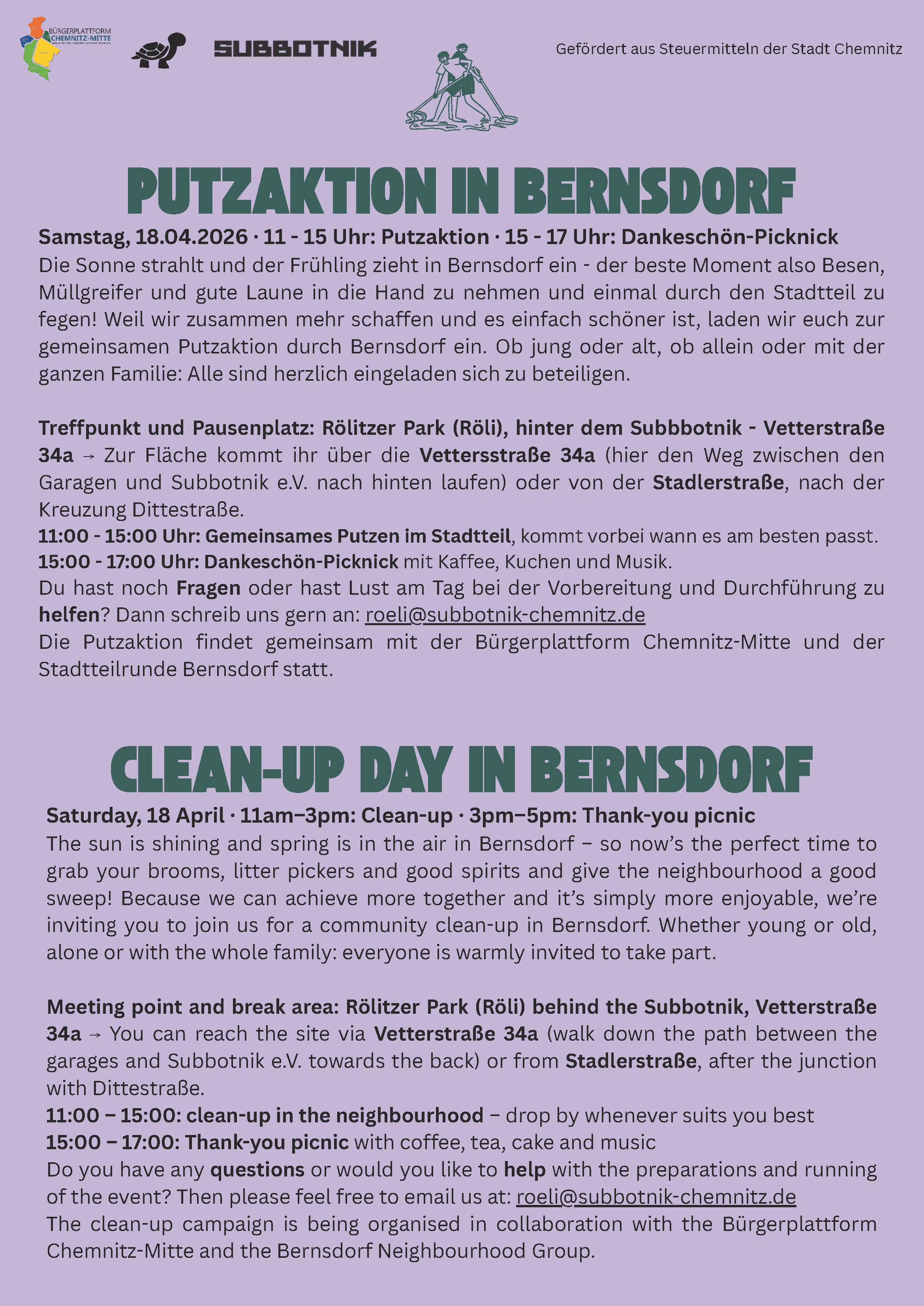 - Sonnabend, 18.04.2026, 11:00 - 15:00 Uhr Putzaktion Bernsdorf, 15:00 - 17:00 Uhr Dankeschön-Picknick (Flyer im Anhang)