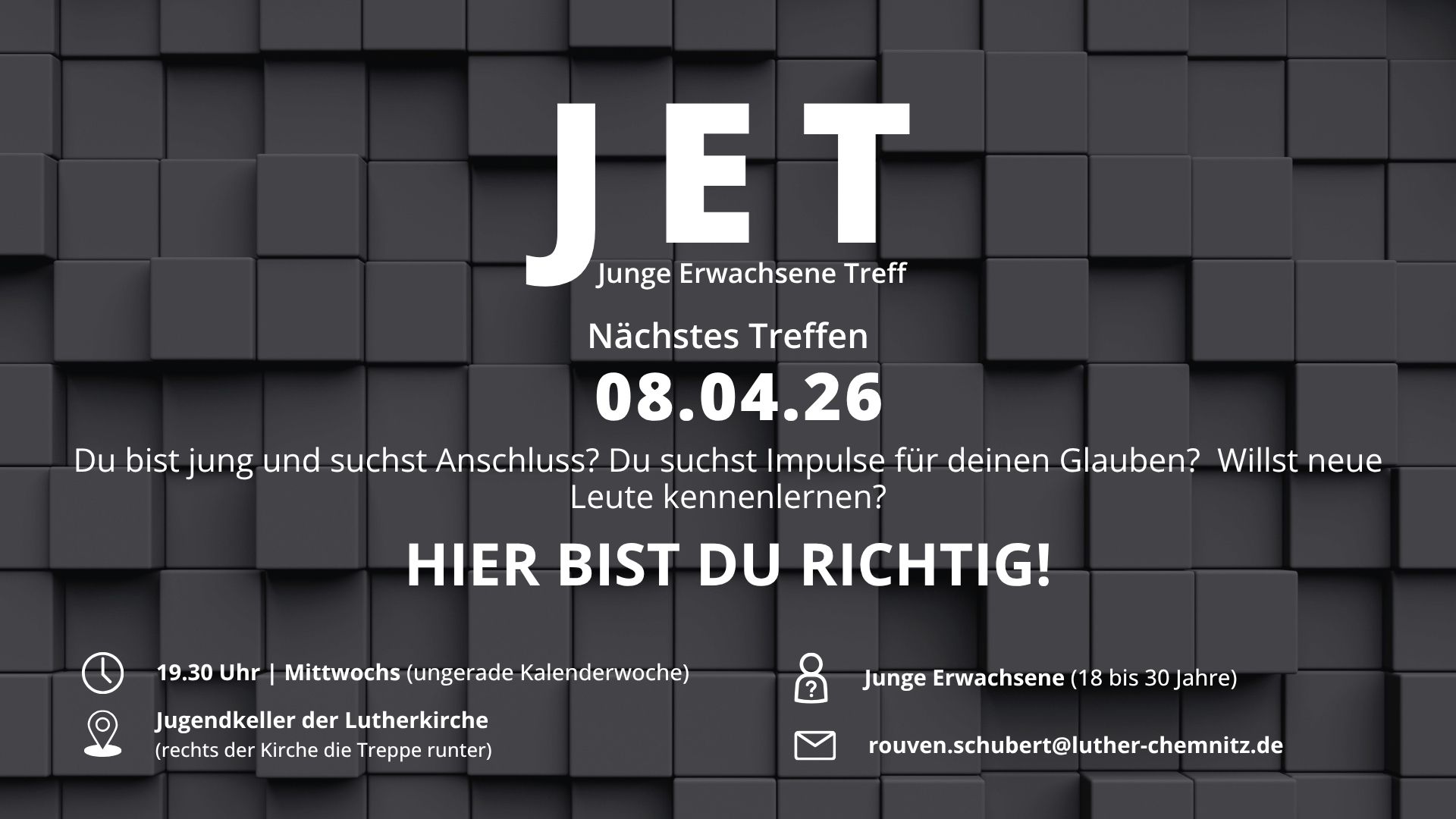 - Mittwoch, 08.04.2026, 19:30 Uhr, Junge-Erwachsene-Treff im Jugendkeller (Flyer im Anhang)